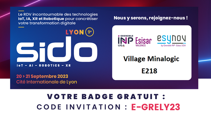 L'Esisar vous donne rendez-vous à la 9ème édition du salon SIDO à La Cité Internationale de Lyon les 20 et 21 septembre 2023. SIDO est l'événement incontournable en Europe de la convergence des technologies IoT, Intelligence Artificielle, Robotique et XR. SIDO réunit des offreurs de solutions tech, groupes industriels, laboratoires de recherche, collectivités, institutionnels de différent secteurs d'activité (Métallurgie, Plasturgie, Chimie, Électronique, Industrie Pharmaceutique, Agroalimentaire, Textile, Machines et équipements..).