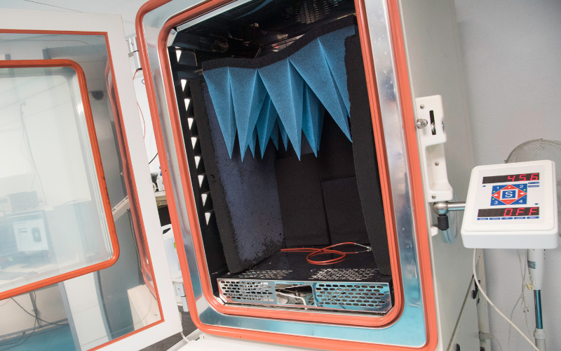 Cette enceinte permet la réalisation d'essais afin de déterminer l'influence de la température et d'hygrométrie sur les propriétés et la fiabilité des matériaux et des échantillons.